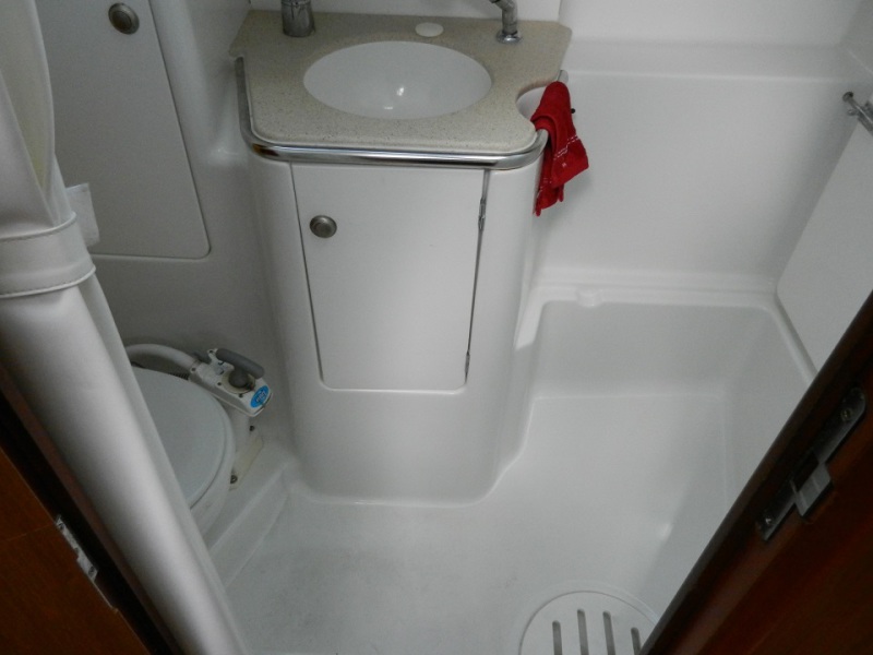 Shower & heads opposite to port with opening deck hatch