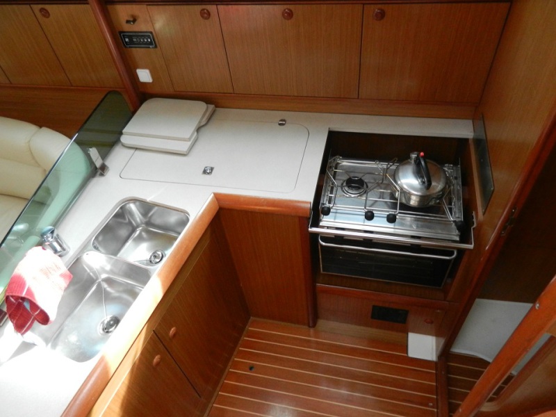 L-Shaped galley to starboard with opening deck hatch