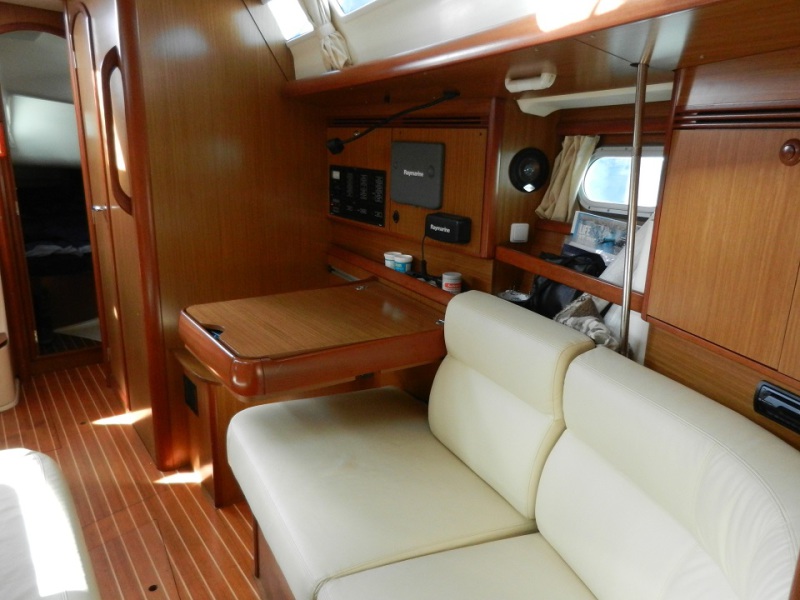 Navigation station opposite to port with a chart table that can slide aft out of the way when not in use. Settee can convert to a single berth
