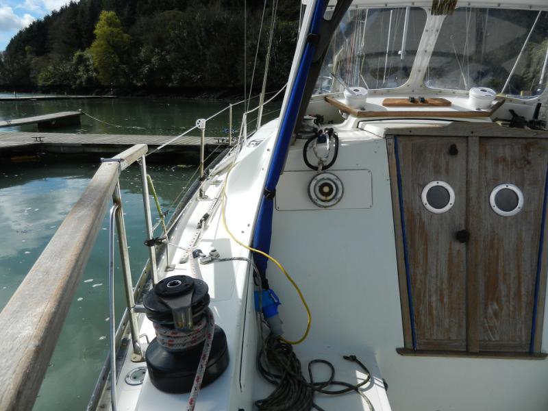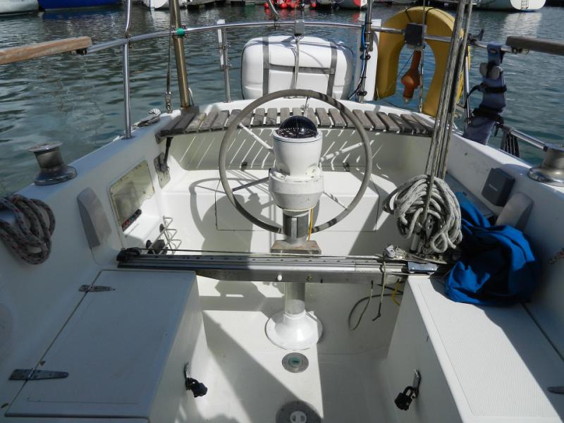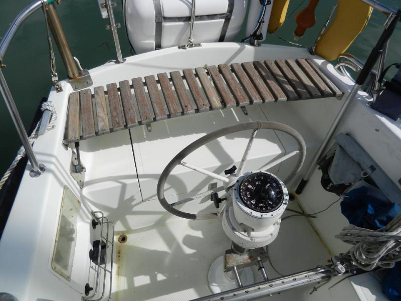 Polywood pilothouse (instead of sprayhood) with canvas extension and polycarbonate windscreen with wipers (all fitted in 2011). It is very effective.