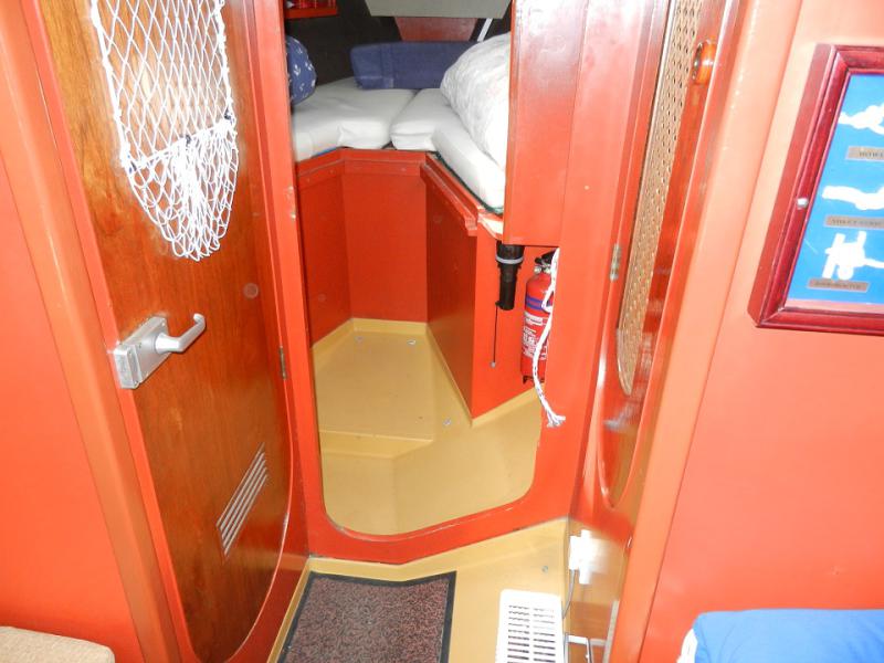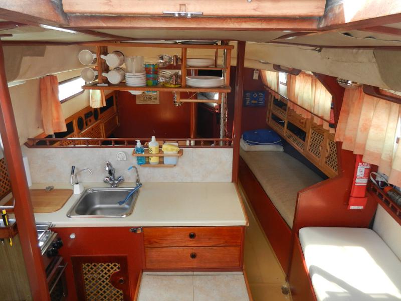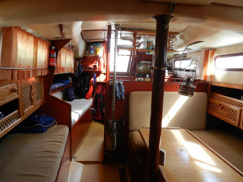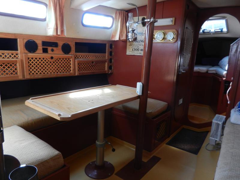 Saloon: U-shaped settee to port with a saloon table that can convert to a double berth. Single settee berth opposite to starboard. 2006 saloon upholstery. Opening deck hatch, Force 10 kerosene cabin heater and loads of lockers.