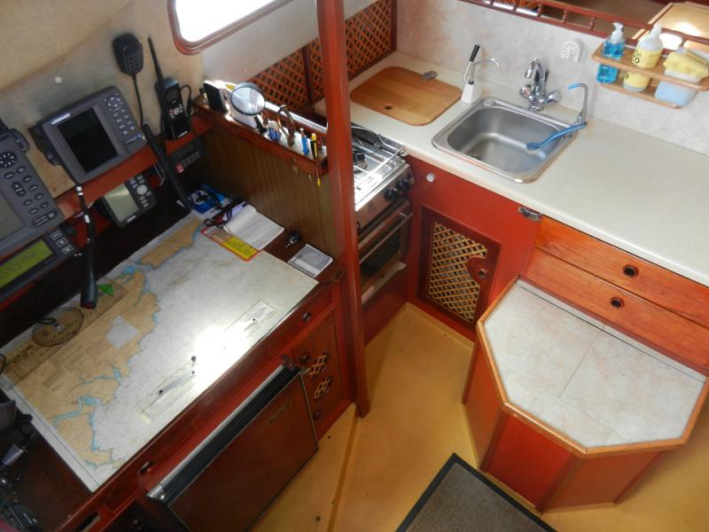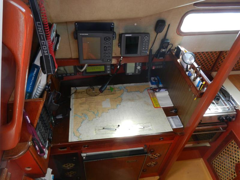 Chart table with chart storage is outboard facing to port and is aft of the galley.