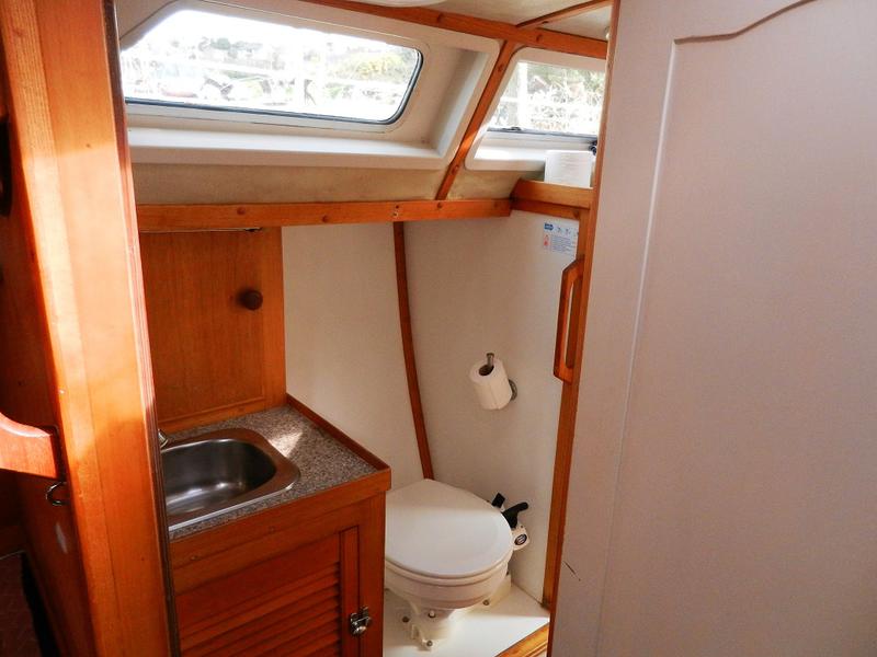 The heads can be accessed from the saloon and from the aft cabin. Marine w.c. with wash hand basin, shower (hot and cold) and opening port at the side of the coachroof and two opening deck hatches.