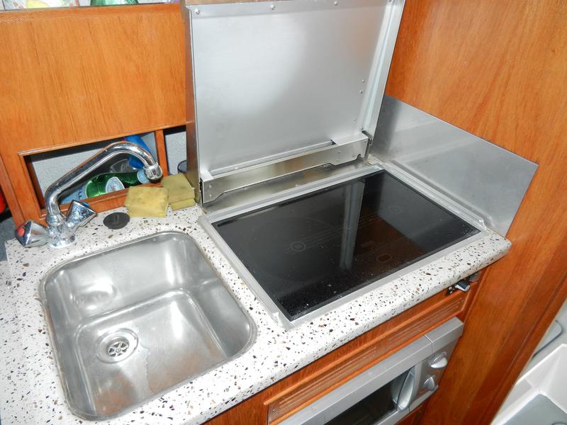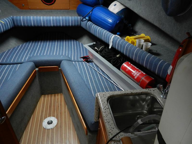 The galley is to starboard and comes with a Wallas diesel hob and lid to provide heating in the cabin, stainless steel sink (hot water), microwave and storage lockers.