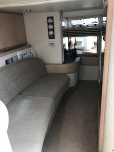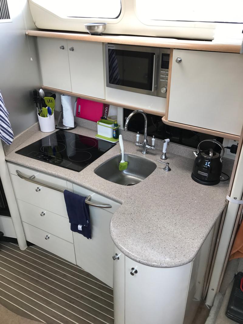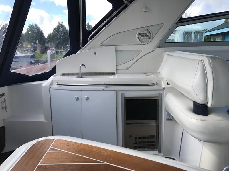Stepping past the generous swim platform You enter the cockpit area with refreshment centre to port complete with sink, ice maker and ample storage and seating for up to 12 people.