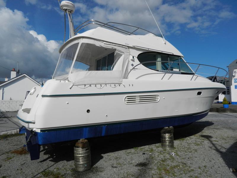 This 2002 Jeanneau Prestige 32 is fitted with twin 285HP shaft driven KAMD 300 Volvo diesel engines giving a top speed of 28Kts and cruising at 22 Kts. Her shafts are in half tunnels keeping the props close to the hull and reducing the boats draft. The accommodation is finished to a high standard, making her very comfortable. Large flybridge with aft facing sun lounger and an aft bench seat that can convert into a sun lounger. Her engines have just been serviced (August 2017) and she has been freshly anti-fouled and is ready to go afloat.